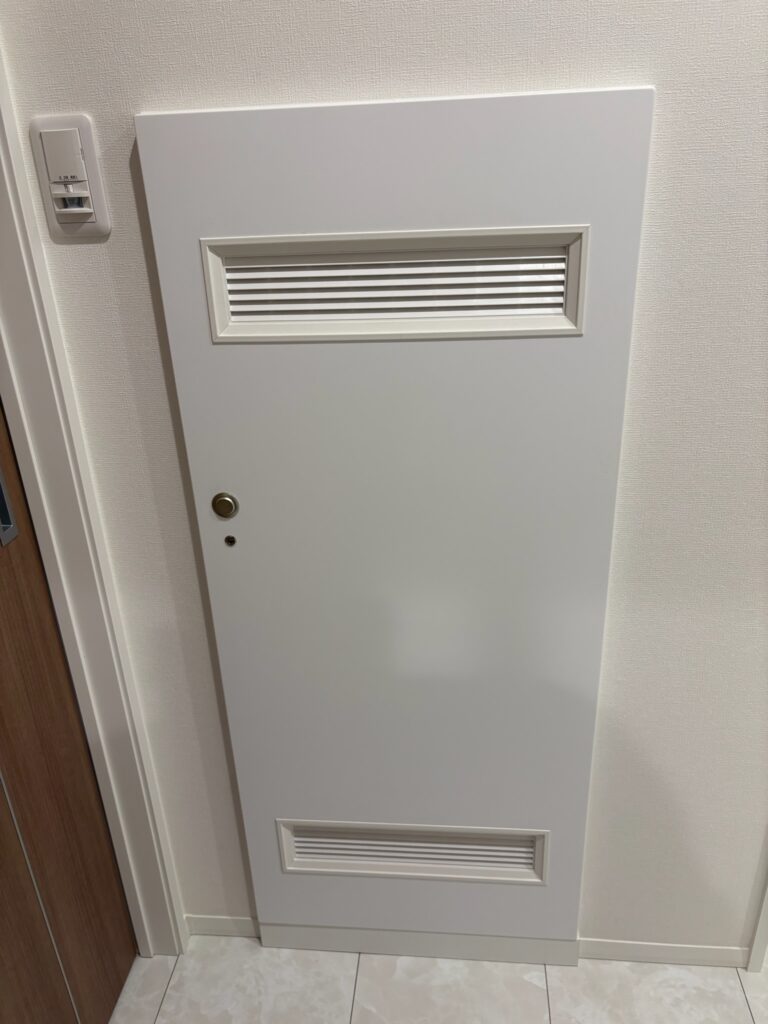 扉の色は写真だと濃く見えるけどグレーです。統一感が良い。タオル掛けは標準で1か所。