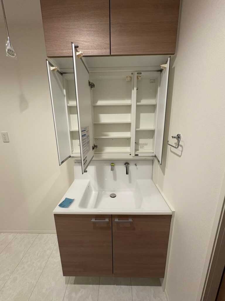 洗面台は小さい方の DS23-R111 を選びました。「小さい=収納足りない?」って思ってたけど、今のところ全然いけてます。意外と強い。
