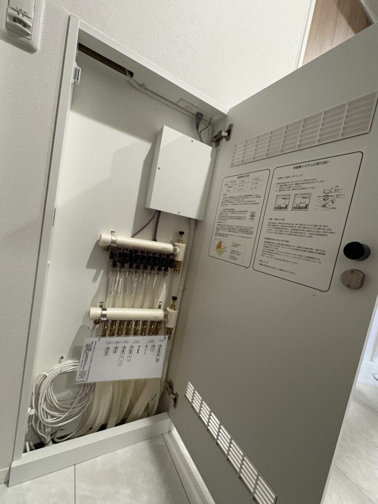 洗面台向かいに床暖の分岐栓ボックスがあります。普段は開けないけど、配管がきれいで「工事ってこういうの見ると安心する」やつ。職人技を感じる。