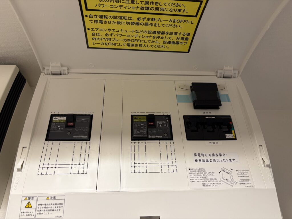 - 太陽光用ブレーカ(使えるようになったらスイッチを上げる)